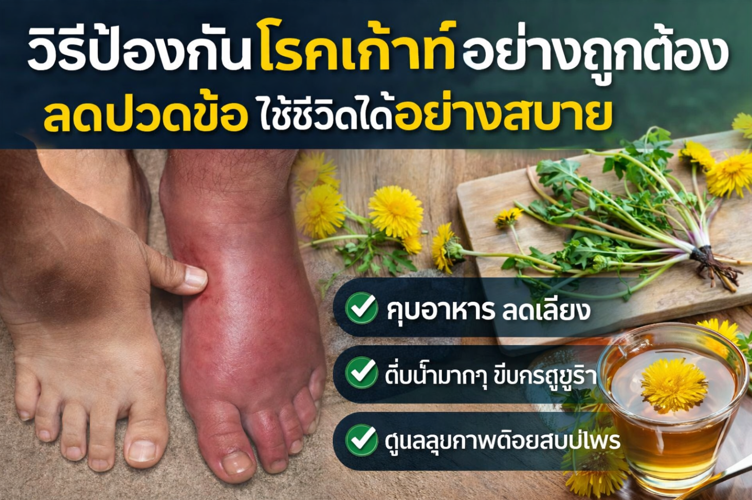 การป้องกันโรคเก๊าท์อย่างถูกวิธีจะช่วยลดความเจ็บปวด เพิ่มคุณภาพชีวิต และลดโอกาสการกลับมาเป็นซ้ำในระยะยาว